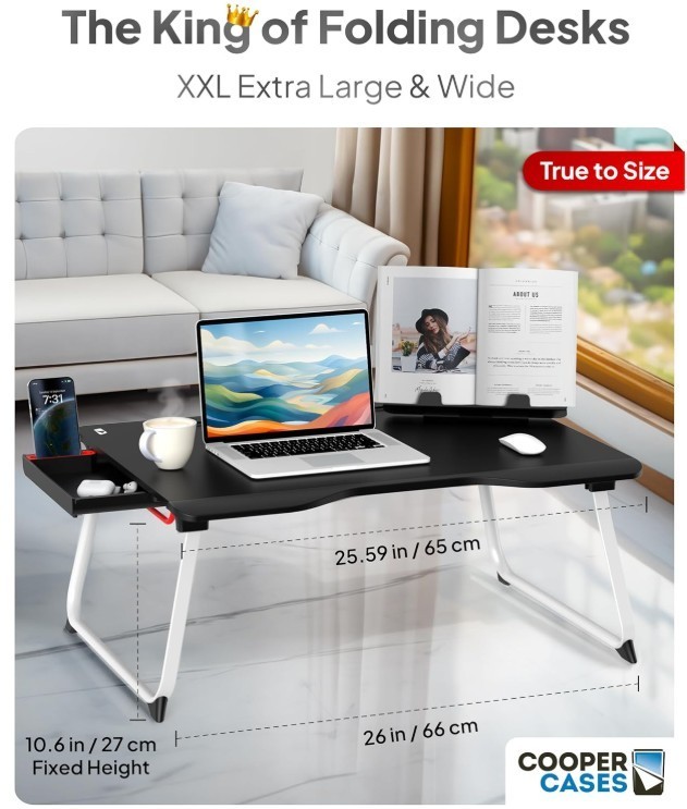 Work, Study, Play: Spend hours on the foldable laptop lap desk to study for exams, recover from injury. Use as floor table for sitting, floor desk or bed computer table for laptop. XXL Extra Large Lap Desk: Massive portable laptop desk with wide 25.6" x 19.3" surface; super stable non-adjustable (fixed) 10.6" table height with big space to cross legs; computer lap desk for bed supports up to 88 lb.